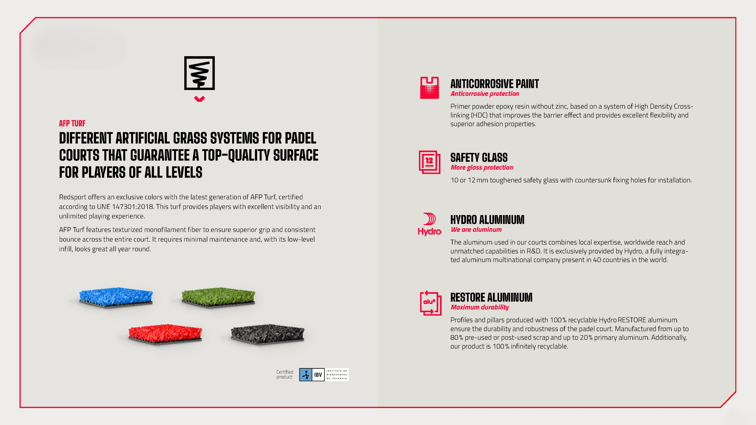 מגרשי פאדל מאלומיניום redsport מציעים תכונות ייחודיות בשוק והם ללא תחרות עבור התקנות חיצוניות.